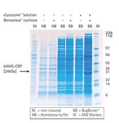 BugBuster® reagent is superior to "Home Brew" lysis buffer and BugBuster® reagent with both Benzonase® nuclease and rLysozyme solution yielded lysates with the most 6XHis-CRP. (A) E.coli lysates (5μL of 1 mL total lysate) from various lysis protocols were fractionated and analyzed by SDS-PAGE. A band correspondinf to 6XHIS-CRP is prominently visualized in the BB +/+ lane.