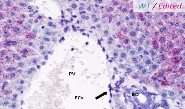 One major application for the BaseScope™ Duplex Assay is to identify gene edits in specific cell populations by duplexing RNA ISH cell marker probes and edit-specific probes. The BaseScope™ Duplex assay can discern if the CRISPR/Cas9-mediated mutation is mono- or bi-allelic with duplex of WT and edited probes.