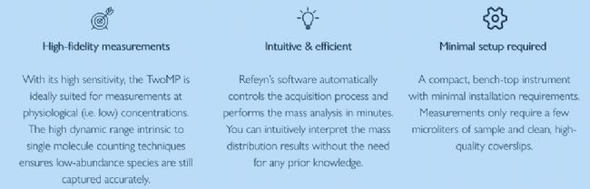 Figure 1 Mass photometry with the Refeyn TwoMP allows mass measurements down to 30 kDa and features improved peak resolution at the detection limits.