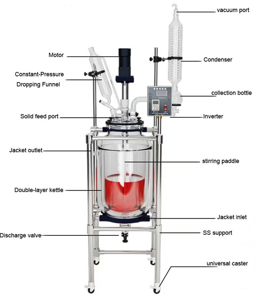 Jacketed glass reactor is a kind of laboratory and pilot-scale production equipment featuring a double-walled, high-borosilicate glass design. It can achieves precise temperature control by circulating heating or cooling fluids through its jacketed interlayer, and is widely used in fields such as biopharmaceuticals, fine chemicals, and new material synthesis. It can perform reactions—including concentration, distillation, reflux, separation, and purification—under conditions of constant speed, constant force, and constant temperature, it serves as an ideal instrument for educational instruction, laboratory experimentation, pilot-scale trials, and industrial production. This product can be seamlessly integrated with a range of auxiliary equipment, such as circulating water vacuum pumps, diaphragm vacuum pumps, low-temperature circulating pumps, circulating coolers, high-temperature constant-temperature circulators, low-temperature coolant circulation pumps, and integrated high/low-temperature circulation units.We can offer 1L-200L and customization.