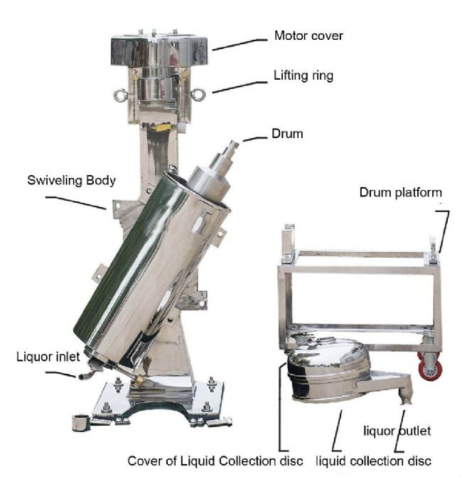 Working principle The electric motor transmits power to the main spindle via a transmission system, thereby driving the rotating drum to spin at high velocity. The material to be processed is injected into the drum through a feed inlet located at the bottom; under the influence of powerful centrifugal forces, the liquid mixture undergoes stratification. The lighter liquid phase accumulates toward the center of the drum, flows upward to the outlet at the drum's upper rim, and is subsequently flung into a liquid collection tray before draining out. Conversely, the heavier solid phase is flung against the inner wall of the drum, where it accumulates; once the machine is shut down, the drum is removed—facilitated by the tilting mechanism of the centrifuge body—to allow for the manual cleaning and removal of the accumulated solids.