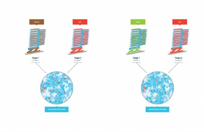 Common applications include co-localization studies to map co-expression of two targets within the same cellular context (e.g. secreted ligand and its receptor) or to profile gene expression in a specific cell type expressing a known marker (e.g. a specific stem cell marker). To distinguish between the two targets, individual probes are used in probe channels 1 (C1) and Channel 2 (C2). Channel 1 (C1)  is detected using HRP based diaminobenzidine (DAB) reaction resulting in a dark brown signal and Channel 2 (C2)  is detected using an AP Fast Red based reaction resulting in a red color. Due to the brightness of the red chromogen, it is advised that the lower expressed target be ordered in the C2 channel and stronger expressed target be ordered in the C1 channel.The stained slides are visualized with a bright-field microscope.