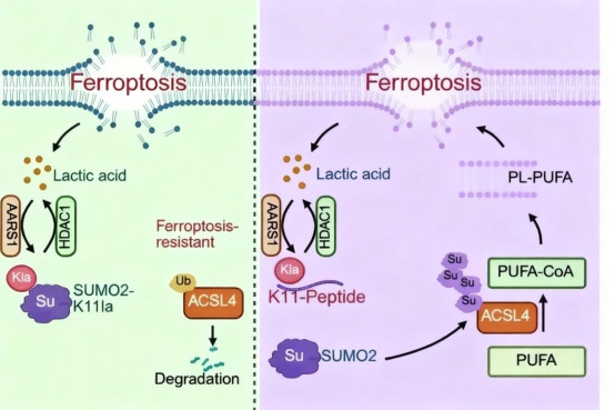 Mechanistic studies revealed that SUMO2-K11 lactylation affects ferroptosis sensitivity by regulating the stability of Acyl-CoA Synthetase Long Chain Family Member 4 (ACSL4). ACSL4 is a key executor of ferroptosis, responsible for catalyzing the esterification of polyunsaturated fatty acids, promoting the generation of lipid peroxidation substrates. Researchers found a direct interaction between SUMO2 and ACSL4, and SUMO2-K11 lactylation could weaken this interaction.
