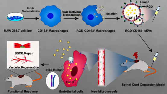 Preclinical Efficacy Validation: In vivo studies confirm that intravenous injection of RGD-modified EVs (loaded with CD163-positive macrophage-derived factors) accumulates at SCI neovascular regions, significantly enhancing vascular network reconstruction and BSCB function. Treated animals show improved motor function and neural conduction, while in vitro experiments demonstrate enhanced endothelial cell tube formation, migration, and barrier integrity.