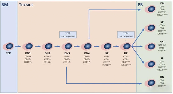 T cells undergo a highly programmed developmental process: Origin: Bone marrow-derived progenitors migrate to the thymus. Double-Negative (DN) Stages: DN1-DN4 subphases, defined by CD44, CD25, and CD117 expression; pre-TCR expression initiates at DN3. Intermediate Single-Positive (ISP) Stage: Transition to CD8+ ISP before acquiring CD4 to become double-positive (DP) cells. Selection: DP cells undergo positive (MHC recognition) and negative (self-antigen tolerance) selection. Differentiation: Mature into CD4+ or CD8+ single-positive (SP) αβT cells; alternative pathways produce γδT cells and NKT cells.