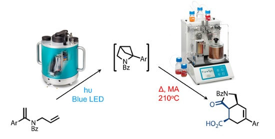 Using this experimental set-up - the researchers were able to demonstrate a unique example of a photothermal daisy-chained process combining a visible-light-mediated photochemical initiation and a thermal cascade reaction as a fully continuous process yielding 20 grams / hour. This process was facilitated by the ability to employ acetonitrile as solvent at high temperature under pressurised conditions and the precise control of residence time and temperature in the flow reactor which enabled the isolation of a reactive diene intermediate on a scale and yield not achievable under batch conditions.