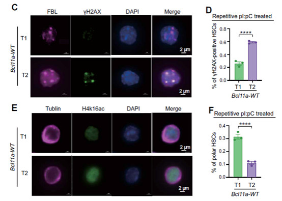 Figure 1: The number of γH2AX-labeled DNA damage foci is significantly reduced in HSCs overexpressing Bcl11a; the polarized state of H4K16ac is more stable in HSCs overexpressing Bcl11a. Scale bar = 2μm