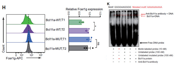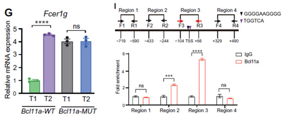 To clarify the molecular target of Bcl11a in regulating HSC quiescence, the research team combined CUT&Tag (chromatin binding site detection) with RNA-seq and ATAC-seq analyses. They found that Bcl11a can directly bind to the promoter region of the Fcer1g gene and inhibit its expression. Fcer1g is a common subunit of Fc receptors, and the signals mediated by it can activate HSC differentiation and impair self-renewal capacity (Figure 2).
