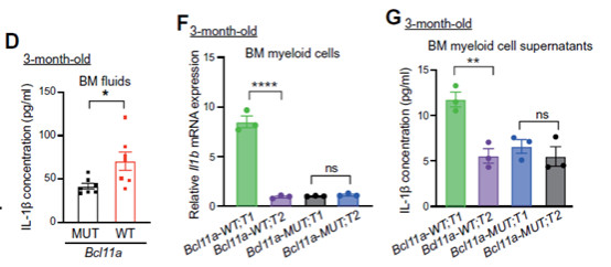 In this critical link, Absin's IL-1β ELISA Kit (abs520001) played a core role. The research team used this kit to accurately detect the IL-1β levels in bone marrow fluid and myeloid cell culture supernatants, directly confirming that the bone marrow IL-1β concentration in mice overexpressing Bcl11a was significantly higher than that in control mice, and the ability of myeloid cells to secrete IL-1β was significantly enhanced (right panel of Figure 3). This result provided direct quantitative evidence for the conclusion that "Bcl11a regulates the bone marrow microenvironment through IL-1β."