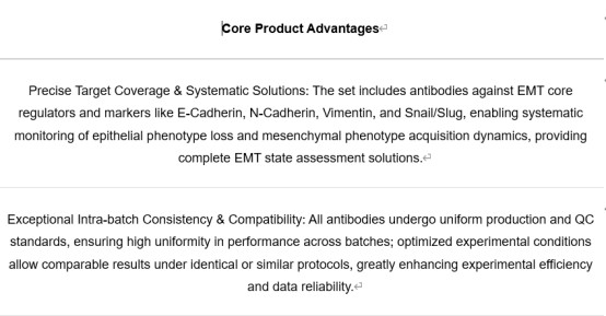 Hangzhou Start Biotech Co., Ltd. has independently developed the "Epithelial-Mesenchymal Transition Antibody MiniAb Set" (Product Name: Epithelial-Mesenchymal Transition Antibody MiniAb Set, a highly targeted, exceptionally compatible, and consistent EMT research toolset. This set features specific antibodies against key epithelial and mesenchymal markers, rigorously validated across platforms including immunohistochemistry (IHC), Western Blot (WB), and immunofluorescence (IF). It holds significant application value in tumor metastasis mechanisms, tissue fibrosis, and embryonic development research.