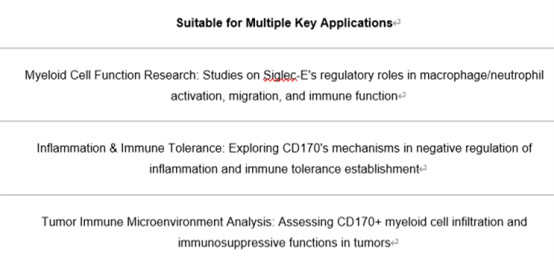 CD170-targeted interventions show promising prospects in cancer immunotherapy. Preclinical studies confirm that antibody blockade of CD170 or enzymatic removal of surface sialic acids can effectively restore T cell anti-tumor function. Notably, in human monocyte-derived MDSC models, CD170 blockade similarly reduces immunosuppression, indicating conserved mechanisms across species. These findings provide theoretical foundations for developing novel combination immunotherapy strategies.