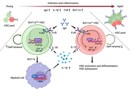 * Non-cell-autonomous impairment: Bcl11a promotes the secretion of IL-1β by bone marrow myeloid cells, activates HSC differentiation through the IL-1β-Fcer1g axis, and accelerates their exhaustion.